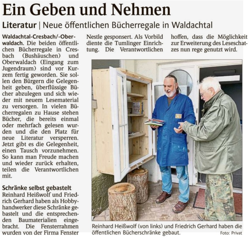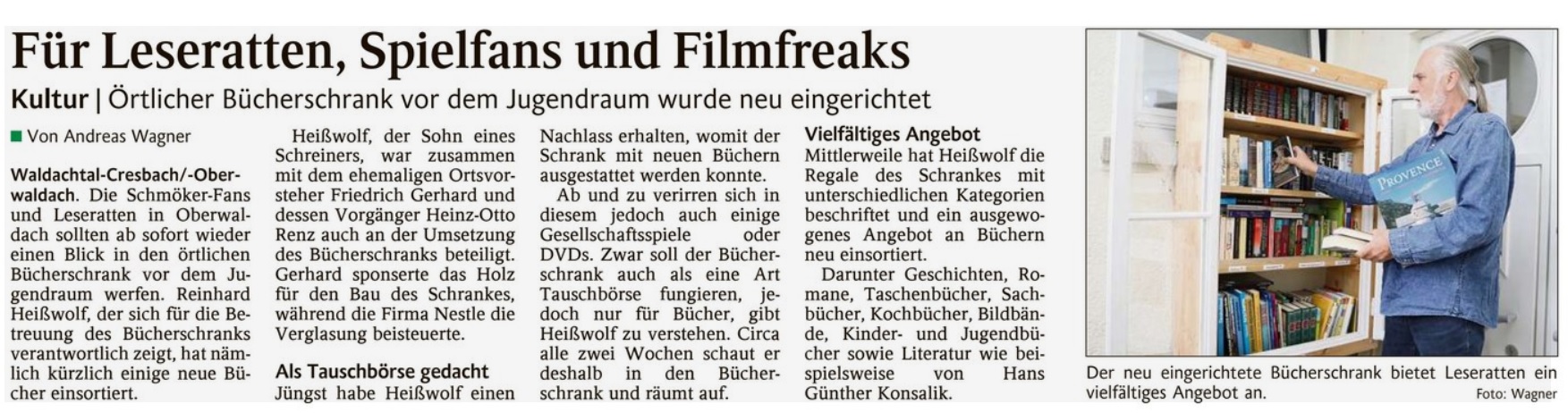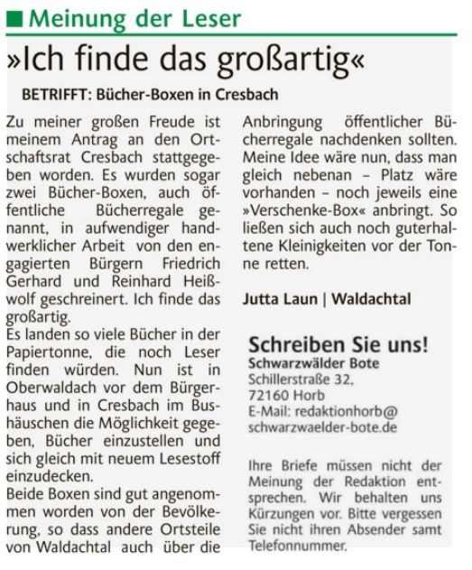 Bei mir ist immer viel los, aber das letzte in der Zeitung war:Schwabo von 0305